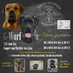 Genau am errechneten Termin dem 14.08.2022, einem Sonntag, kam unser G-Wurf aus Elif vom Sax und Cooper vom Wächter des Zeus, auf die Welt. Es wurden 10 gesunde Welpen geboren. Leider hat ein Welpe den ersten Tag nicht überlebt. Der Wurf besteht aus 5 Buben und 4 Mädchen in den Farben falb, tan, schwarzgestromt, schwarz, alle mit unterschiedlichen weißen Abzeichen. Für uns ist es ein sehr interessanter Wurf, auf welchen wir uns sehr gefreut haben. Wir werden aus dieser Verpaarung eine Hündin in der Zucht behalten.