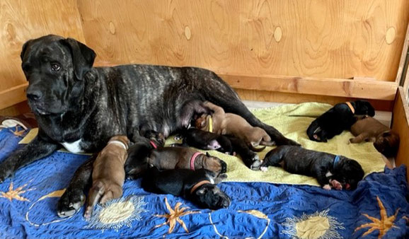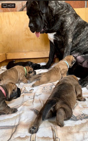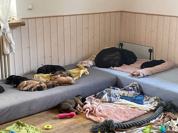 Die Hündin liegt entspannt auf "meinem" Bett und schläft friedlich! ich schlafe nicht! Die Stunden vergehen und endlich lässt die Hündin ein Hecheln hören. Man ist sich sicher, jetzt aber, jetzt geht es los! Nein, nach 10 Minuten ist das Hecheln vorbei und sie schläft wieder. So kann dann schon mal eine Nacht und ein Tag vergehen. Elif begann mit ihren Geburtsvorbereitungen am 13.08.22 um 3:00 Uhr morgens. Aber alles sehr untypisch, so dass man beim besten Willen keine Prognose abgeben konnte. Am Abend war dann noch immer kein typischer Geburtsbeginn zu erwarten und so legte ich mich mit Elif um 23:00 Uhr zum Schlafen hin. Elif total relaxt ohne Hecheln und ich hundemüde! Genau um 3:15 Uhr erwachte ich erschrocken, da Elif einen gewaltigen Satz über mich machte. Ich war sofort hellwach und konnte noch im vorbeispringen erkennen, dass sie bereits Presswehen hatte und sich der erste Welpe ankündigte. Wenige Zeit später war der erste Rüde geboren und nun ging es Schlag auf Schlag. Innerhalb von 4,5 h waren 10 Welpen auf der Welt. Alle kerngesund und mobil! Elif war bei der Geburt mit allen ihren Instinkten dabei und so musste ich nur mäßig Hilfe leisten. Es war eine wundervolle Geburt und wir sind froh, dass beide, Mutter und Welpen, wohl auf sind!
